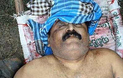 斯里兰卡国家电视台播放的录像画面显示,一个看上去很像是泰米尔猛虎反叛组织领袖的尸体,身穿迷彩服,头的顶部盖着一块布,显然是遮掩一个伤口。