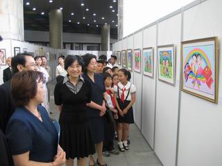 致辞结束后,出席开幕式的领导和学生们参观了书画展。万景台少年宫宽敞明亮的大厅顿时人头攒动、热闹非常,一块块高大的展板前,身穿校服、围系红领巾的朝鲜少年儿童们兴高采烈地观看着一幅幅书画作品。上海市对外文化交流协会代表团团长高岭女士参观书画展后表示,朝鲜少年儿童的书法和绘画水平高超,显示出了扎实的艺术功底,且主题性强,表达了他们对中朝友谊的祝福。朝鲜对外文化联络委员会副委员长田英进也表示,中国少年儿童的想像力、创造力丰富,通过画作表现出了积极向上的精神面貌和对未来的向往。