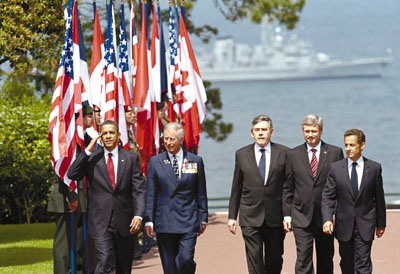 会面后,4人之后会一同前往美军墓园,与英国首相布朗、英国王储查尔斯和加拿大总理哈珀会合。奥巴马在墓园内向包括200名美国退役军人的9000人发表讲话。