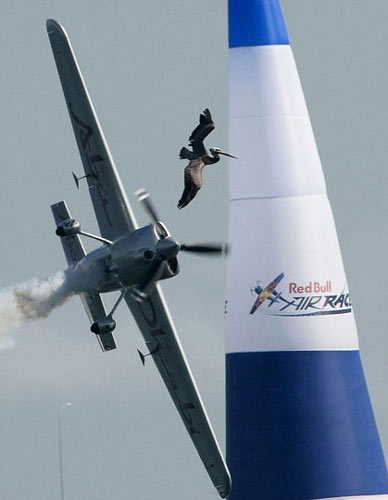 中新网5月12日电 据英国媒体报道,“红牛竞飞世界巡回赛” 最后一轮比赛10日在美国圣地亚哥举行,观众们在欣赏惊心动魄的特技飞行表演的同时,还意外目睹了一幕恐怖景象——一只硕大的鹈鹕欲与高速飞行的飞机争夺“制空权”,最后竟被飞机的螺旋桨生生击碎!