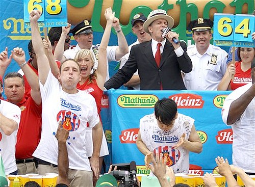 切斯纳特将获得两万美金奖金。这是他连续第三次夺冠。25岁的切斯纳特来自加利福尼亚。据信,除了吃热狗以外,他还打破吃其它食品的世界纪录,如七分钟内吃掉五公斤的意大利面,10分钟里吃掉188个墨西哥辣椒。