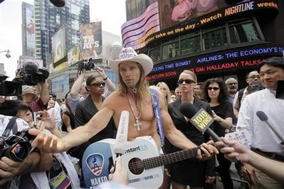 据台湾中广新闻等媒体报道,38岁的Robert Burck当地时间22日在纽约时报广场宣布要出马角逐市长,他光著上身,只穿一条白色内裤、牛仔靴和一顶牛仔帽,他宣称,自己对于如何用最少的资源,创造最大效益,非常在行,他准备用这项本事,挑战纽约现任市长彭博。