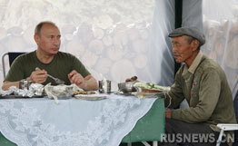 当普京在一个无人的山地停留时发现一群羊,一名当地的牧羊人正在放羊。普京邀请牧羊人与他一起喝茶,而牧羊人回请普京到他的住处去看看。普京同意之后,牧羊人返回家中,过了一会儿,他和自己的儿子一起同返回,还为普京牵来一匹马。