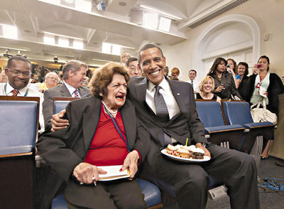 8月4日是奥巴马48岁生日,也是赫斯特报系专栏作家汤马斯的89岁生日。白宫首席发言人吉布斯在白宫新闻发布室内进行每日简报,大批记者聚集向他提问,此时,奥巴马捧杯形蛋糕入内,带领记者团为汤马斯唱生日歌。