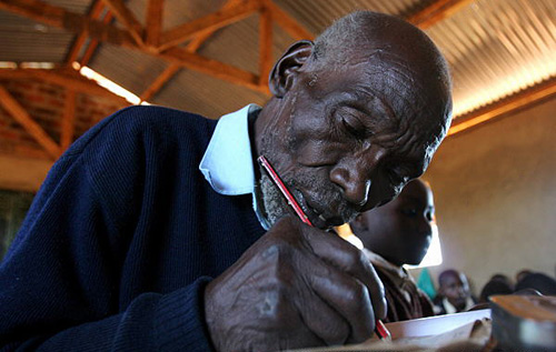 据台湾中广网报道,肯尼亚农夫马鲁格已经当了曾祖父,他没有上过学,一辈子不识字。几年前肯尼亚开始实施小学义务教育,他抓住这个机会,成为全世界最高龄的小学生。他说他想上学,因为这样他才能阅读圣经。他说,除非瞎了或是去见上帝,只要他在世一天,他就不会停止读书,因为有了知识才有自由。