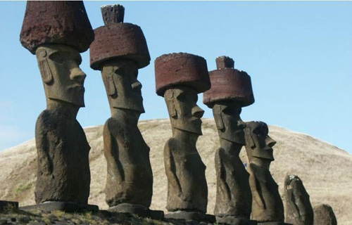 复活节岛位于太平洋东南部,属智利管辖,全岛发现1000多尊巨大的半身人面石像,其中600尊整齐地排列在海边,有些石像头上戴着红色石料制成的帽子