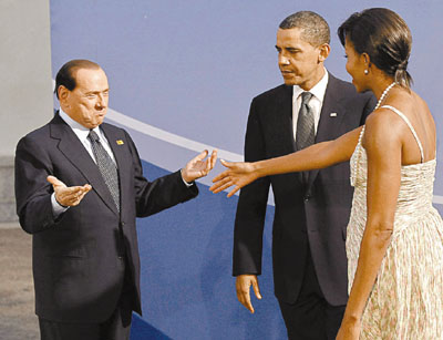 中新网9月26日电 意大利总理贝卢斯科尼好色已是“公认的事实”,连美国总统奥巴马夫妇似乎都有所耳闻。在7月的意大利G8峰会,奥巴马就被拍到拒绝与其握手的画面。在24日的G20晚宴上,老贝再次在奥巴马夫妇处遭遇尴尬。