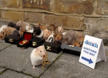 这项活动一推出,英国民众便纷纷帮自家的仓鼠拍摄音乐视频并寄给主办单位。主办者饿专门制作了一批迷你乐器——如竖琴、迷小号、萨克斯管、长号、小鼓等——给仓鼠们使用,并在咖啡馆外进行了一轮又一轮的“海选”。