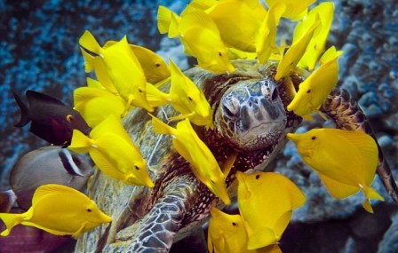 据报道,摄影师麦克.罗伯茨(Mike Roberts)在夏威夷普阿科(Puako)潜水时,发现一只海龟安静地停留在水中,等待一群颜色鲜艳的鱼在其身边忙碌地“工作”,为它啄去身上的寄生物,替它“洗澡”。