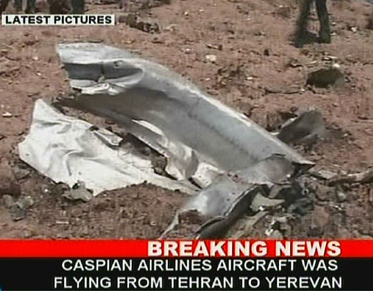Sirous Saberi官员说,飞机在空中燃起大火后坠毁,在地上可以看见飞机的各个l零部件四处散落。