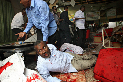 根据索马里过渡政府通报的情况,在典礼过半之时,一名男扮女装的“人弹”站起来径直走到主席台前,引爆了绑在身上的炸弹,现场随即变成一片“血海”。索马里过渡政府卫生部长、教育部长、高等教育部长及文化部长当场身亡,体育部长身受重伤,其他死伤人员包括参加毕业典礼的大学生、教职人员、学生家长及当地媒体记者。
