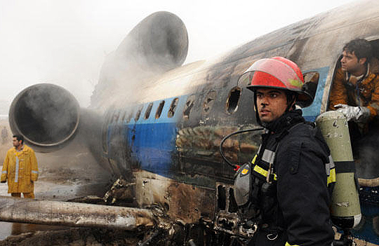 另外,伊朗官员称这架苏制TU-154客机尾部起火,随后客机冲出跑道,尾部断裂。