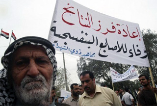 他们手持标语,上面写着“我们要求重新计票”,并高呼:“不,不要欺诈!是的,支持马利基!支持伊拉克!”