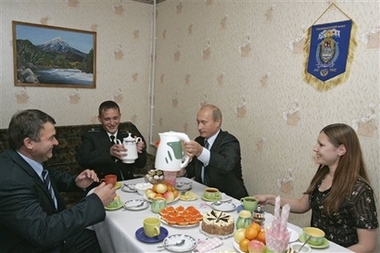 普京总统察看了住宅楼面,然后走入楼内并在按合同在“布拉茨克”号核动力潜艇上服役的维塔利·舍别列夫海军上士和他的妻子波林娜住房内停留片刻。主人请总统与他们一起喝茶。落座后,普京问维塔利收入多少。他回答道:“2.2万(卢布)。”