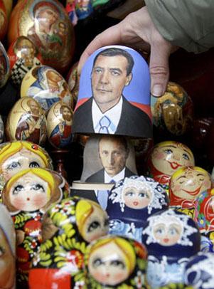 记者登陆一家出售政治人物肖像的网站后发现,梅德韦杰夫像和普京像在价格上已经“平起平坐”。