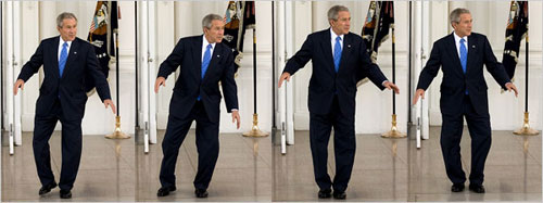 中新网3月7日电 美国共和党总统参选人麦凯恩5日铁定取得党内提名,气势逼人,约了总统布什吃午餐,作为布什正式宣布支持他的前奏,但竟然大牌到要布什在白宫门前久等。布什为打发时间,竟在一众记者面前跳起踢跶舞(见图),满堂发笑。