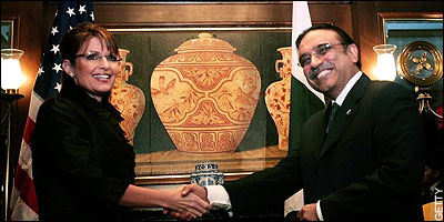 在美国有线电视新闻网发布的一张照片中,佩林与扎尔达里“微笑握手”,扎尔达里毫不掩饰他对佩林的赞赏之情,称赞佩林“漂亮迷人”,并明确表示希望能有机会再次与佩林见面。分析人士表示,佩林已经在纽约联合国大会上展示出她的魅力,与很多领导人面对面交谈,以此证明她能够在世界舞台上发挥作用。
