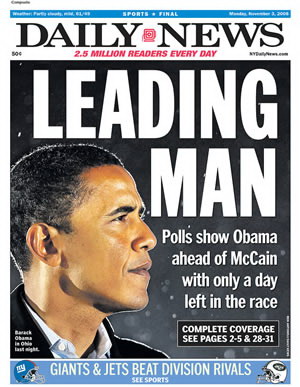 中新网11月4日电 据星岛环球网报道,在大选投票还有最后一天之际,《纽约邮报》和《纽约每日新闻》等美国主要报纸11月3日在头版都提前刊登了奥巴马获胜,成为白宫新主人的消息。