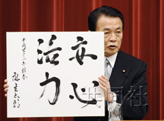 麻生在记者会上展示自己的书法杰作。他说:“我下定决心面对此时的困难时局,对人民的期望作出反应。我要保护人民的生计。财政预算案是最重要的经济政策。”