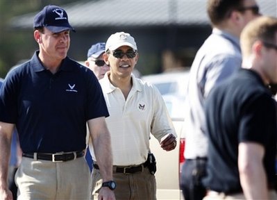 奥巴马是在摄氏30多度的气温下打球的,陪同他的有美国商务部长等多位高官。美国前总统克林顿等人都喜欢在这个空军基地打球。
