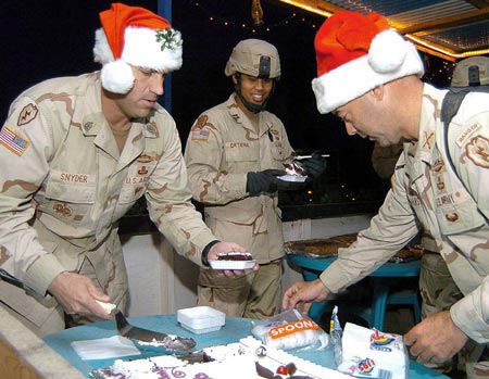 根据往年惯例,战后每个圣诞节,都有高级别美军官员赶赴伊拉克,为奋战一年的官兵打气。美国总统布什、刚卸任的美国国防部长拉姆斯菲尔德都曾选择在圣诞节来巴格达劳军,而今年的劳军人选也许是新任国防部长罗伯特·盖茨。但在多数驻伊美军官兵心中,不禁要问,劳军劳军,可究竟是谁、为什么还要让他们在平安夜里留在这危险的战地,无法和家人团聚。