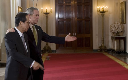 在两个人都很为难的时候,福田明白,他这次如果再要求布什把“绑架日本人问题”与美朝关系捆绑在一起,就是大大地“不识相了”。布什也是心领神会,只不过面对记者,慷慨激昂地表示了一下“我们不会忘记‘绑架被害者家属’”,而不作任何实质性承诺。