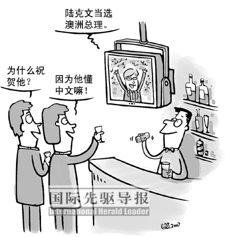 11月24日,澳大利亚联邦大选,工党胜出,50岁的陆克文成为澳大利亚新总理。有人说,陆克文是澳大利亚的布莱尔。这两位政治明星都充满活力、富有亲和力、相貌俊朗,而且同为工党领袖,除了陆克文能讲一口流利的汉语之外,其他相似之极。