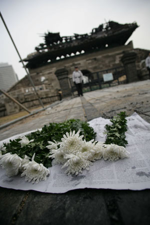在崇礼门废墟前,市民放上白菊花以示哀悼。