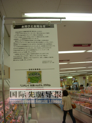 冷冻食品柜台前,立着一个告示牌,“请购买了冷冻豆角的客人一定不要食用。给大家添麻烦了,请买了该食品的客人来退货”。超市工作人员正忙着攀上梯子,挂起新的宣传牌,“有这样白绿相间标志的都是国内工厂制造,请放心食用”。