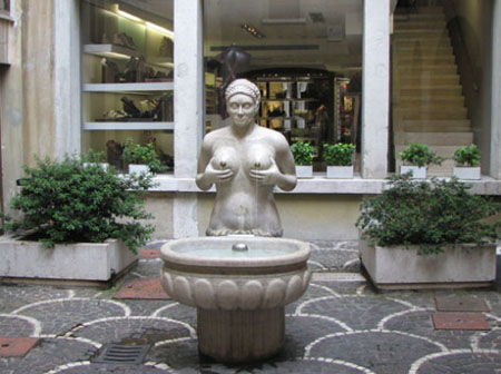 前些天,圆明园两个青铜兽首的拍卖引起轩然大波,然而很多人不知道,兽首的原作者意大利人郎世宁,却是精于女性裸体喷泉设计的人。像这样充分展现人体的情趣喷泉,在人口非常稠密的商业区也能见到。因为曾经有过那样一个黑暗的对人性压抑的中世纪,于是文艺复兴以来,欧洲人对于身体的赞美和歌颂,处处都散发着返璞归真的气息。在人体艺术方面,欧洲人似乎很少去追究色情和艺术的差别,或许在他们眼里,只要能够使城市变得更加具有情趣的东西,就一定是美和艺术的吧。(张樾 )