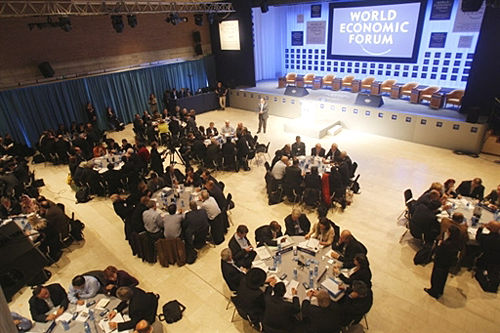 世界经济论坛年会举行圆桌会议,政商领袖讨论经济形势。