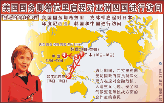 据美国《洛杉矶时报》网站14日报道,昨天,就在国务卿希拉里·克林顿为其上任后的首次海外之行做准备时,她承诺将奉行“既不冲动也不太注重意识形态的”外交政策。她此次在访问亚洲时将面临一系列敏感问题。
