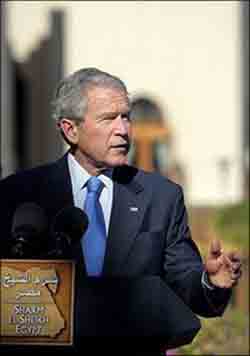 做客以色列和巴勒斯坦,是布什此访的重中之重。在会晤以巴领导人后,布什就巴难民回归、巴以最终边界划分和耶路撒冷地位等以巴冲突核心问题阐述了自己的主张。布什称,难民问题可以通过建立巴勒斯坦国得到解决,同时辅以相关赔偿机制。布什呼吁以色列结束1967年以来对阿拉伯土地的占领,确保巴成为独立自主国家。可他又说,以巴未来边界将不可能完全依据第三次中东战争之前的停火线,双方应根据目前实际情况进行调整并达成协议。关于耶城归属问题,布什认为这是一个棘手难题,牵涉政治和宗教。他再次要求以巴为在今年内达成和平协议作出“痛苦让步”。
