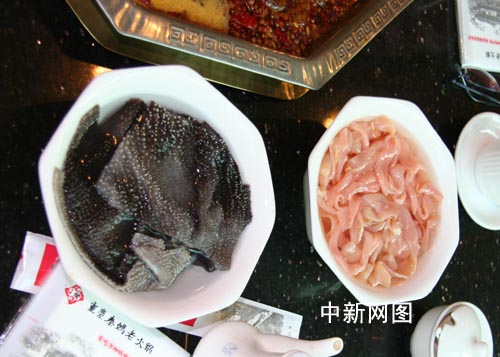 在重庆吃火锅有两道菜必不可少,其一为毛肚(左),另外一道则是鸭肠。(中新网 陆春艳摄)
