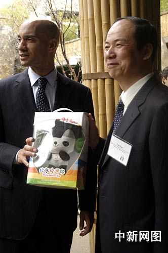 中国国家林业局野生动植物保护司副司长严旬(右)向华盛顿市市长芬蒂(右)赠送明年北京奥运吉祥物之一熊猫晶晶玩具。 作 者:邱江波