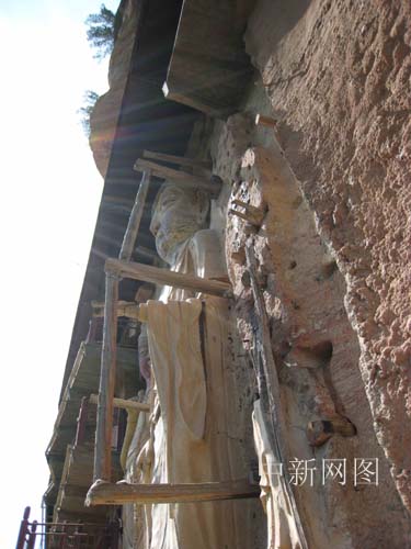 麦积山,地处天水市东南方50公里的北道区麦积乡南侧,这里荟萃着后秦、西秦、北魏、北周、隋、唐、五代、宋、元、明、清等十几个朝代的塑像7200余身,壁画1000多平方米,分布在194个洞窟里,与敦煌莫高窟、大同云岗石窟、洛阳龙门石窟一样,有着珍贵的艺术宝藏。如果就艺术特色来分,敦煌侧重于绚丽的壁画,云岗、龙门著名于壮丽的石刻,而麦积山则以精美的塑像闻名于世。正如中国雕塑家刘开渠所赞美的麦积山是“我国历代的一个大雕塑馆。” 张晓涛 摄