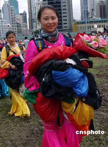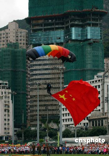解放军八一跳伞队,7月1日在香港跑马地举行庆回归十周年表演,跳伞队的精彩表演。中新社发 谭达明 摄