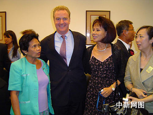 众议员Chris Van Hollen 在庆祝茶会中与各国支持者合影。左起Gloria Sundace(菲律宾)、众议员Chris Van Hollen、Ok-Cha Soh徐玉子(韩国)、刘美玲(加拿大)