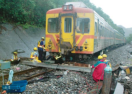 中新网8月27日电 据台湾《中国时报》报道,由台北树林开往台东知本的一○五一次自强号列车,二十六日中午行经台东县鹿野到山里站之间时,铁轨遭土石流掩埋,导致列车出轨,油箱起火燃烧。列车紧急刹车后,拖行三四百米才停止,两人受轻微擦伤,铁路中断七个小时。图为意外发生后,工作人员冒雨抢修。(邵惠琴)