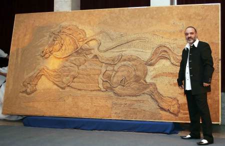 奔马画在地拉那国际文化中心的圆厅展示,让民众观赏。斯特拉蒂曾用50万根钉子钉出意大利大师达芬奇的一幅肖像,是他列入纪录大全的第一幅杰作。