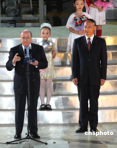 9月10日晚,2007年女足世界杯在上海虹口体育场开幕。开幕式通过古典与历史、青春与现代、柔和与绚烂、激情与速度的视觉演绎,来表达对世界女足运动发展历程的崇高敬意,展现东道主对参加2007年女足世界杯来宾的热烈欢迎。中新社发 汤彦俊 摄