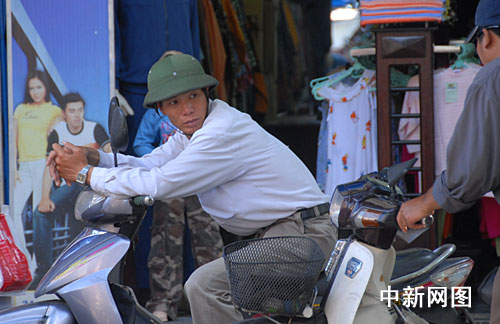 越南有一种像头盔的绿色帽子,这种帽子是越南男士的爱物。他象征着帽子的主人是爱党爱国的英雄,而且据说帽子颜色越深,说明帽子的主人地位越高或财富更多。王红纲 摄