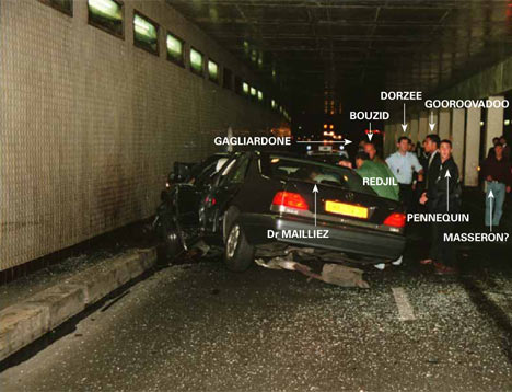人们可以从戴安娜王妃的最后一张照片看到她的金发,保镖琼斯举着手试图防止摄影师拍照,司机保罗则盯着照相机作鬼脸,警方指控他醉酒车。从这张由一名狗仔队摄影师拍摄的照片可以看到坐在奔驰车后座的戴安娜转身看追逐她座车的法国摄影师,坐在她旁边的多迪-法耶兹则身体向前倾,他们刚刚从利兹酒店的后门离开以前往多迪在巴黎的住所。