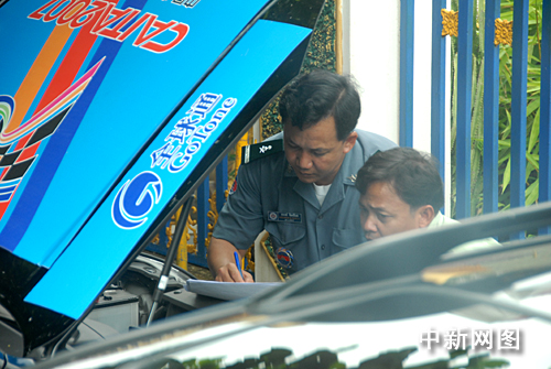 柬埔寨海关人员在检查赛车发动机号