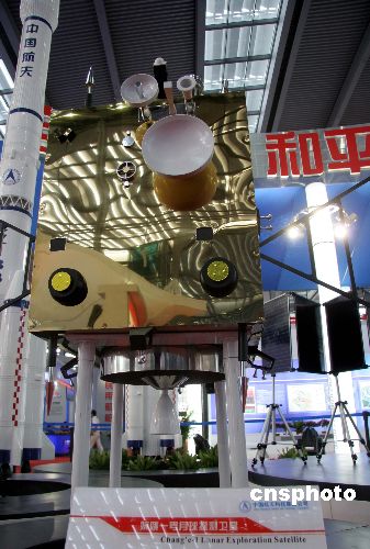 10月11日,“嫦娥一号”卫星模型在深圳高交会上亮相,因其是中国首颗人造月球卫星并即将发射而备受关注。国防科学技术工业委员会副秘书长胡亚枫当天表示,中国探月一期工程已基本完成各项研制任务,“嫦娥一号”卫星发射已进入倒计时,即将实现中国人几千年奔月的梦想。中新社发 孙自法 摄