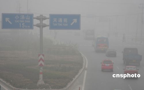 北京大雾蒙蒙,弥漫着的雾气较前日更加浓重。中新社发 吴芒子 摄