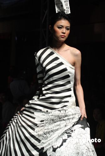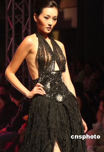 10月26日晚,在湖北武汉举行的“2007佳海杯中国国际服装(院校)设计大奖赛”推出流行趋势发布会专场,来自中国香港的设计师李国华、中国内地顶级设计师吴海燕、杭州的张义超、设计师顾林等五位设计师演绎不同风格的“东方神韵”最新力作。作品既保持民族性,又不失时尚性,呈现出多变灵动的服饰风格,通过新丝路模特的演绎,预告了20007-2008年的时尚走向。图为模特展示中国服装设计师最新流行作品。中新社发 钱兴强 摄