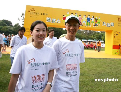 二十七日,小母牛组织香港分会主席梁锦松、小母牛组织爱心大使伏明霞夫妇参加维园举行的小母牛[竞步善行]社会各界同心助国内农民脱贫慈善赛活动,为中国慈善事业出力。小母牛是一家国际非牟利组织,通过向小型农户提供禽畜及饲料技术的培训,协助多国贫困家庭自力更生。中新社发 王丽南 摄