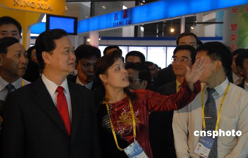 阮晋勇在听取越南参展工作人员的介绍。中新社发 蒋雪林 摄