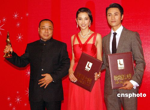,《云水瑶》以八项提名成为大热门,最终继获“华表奖”之后再获金鸡奖最佳影片奖。图为导演尹力与主演李冰冰、陈坤登台领奖。